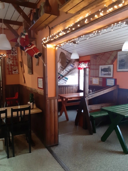 На первом этаже круглосуточно работает кафе с вкусной домашней кухней. Интерьер кафе представит Вам много интересного из быта Карельской деревни
