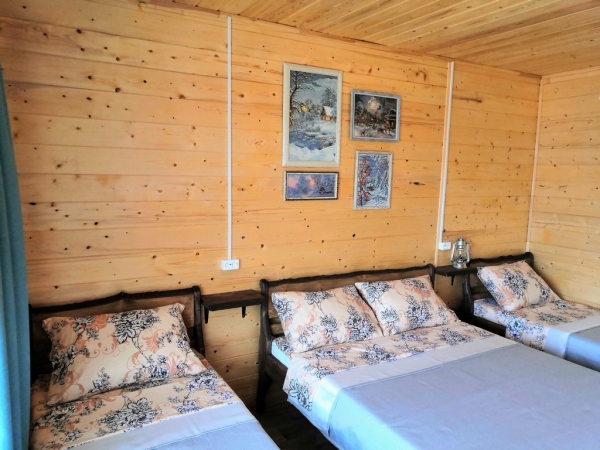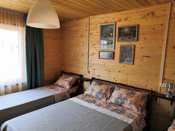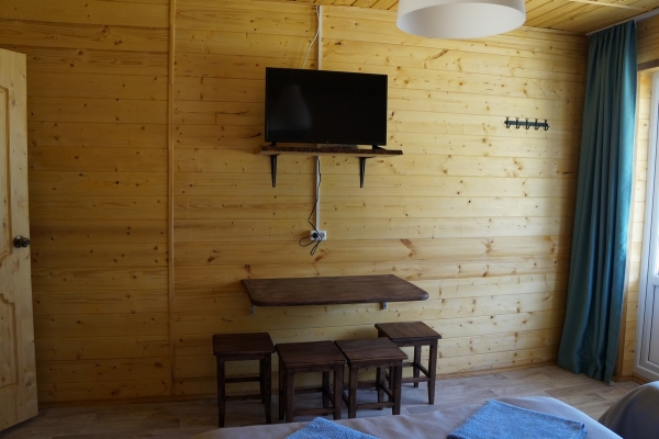 К вашим услугам уютные однокомнатные четырехместные номера. Все номера однотипные с отдельным входом: комнаты с одной 2-х спальной и двумя 1-но спальными кроватями, имеется телевизор, обеденная зона - стол и стулья. В каждом номере собственный санузел с душевой (горячая вода круглосуточно). Для гостей на территории находится уютное кафе с домашней кухней, бесплатная парковка.