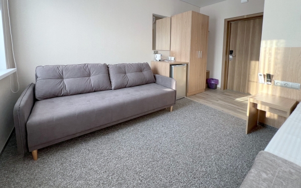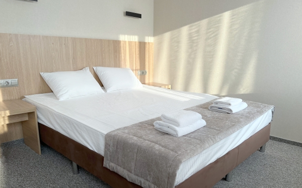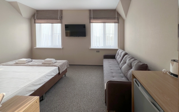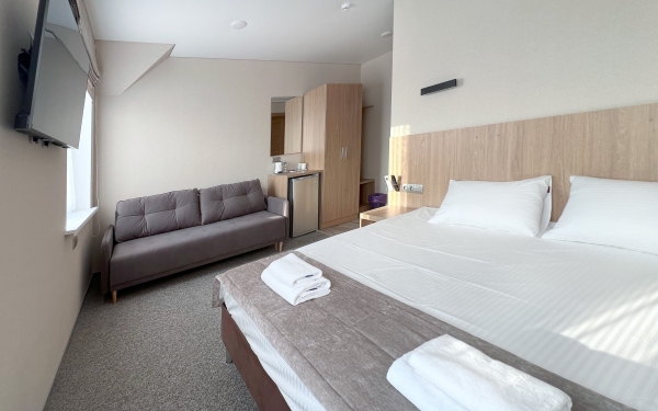 - Просторные номера с двуспальной кроватью 1,8 м и дополнительным диваном или кроватью