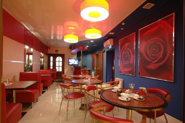 По утрам для гостей сервируется завтрак с различными блюдами в стильном кафе отеля "Ами".