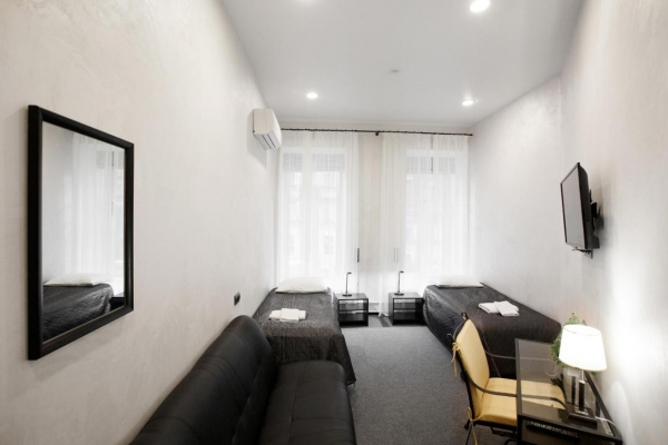 При этом созданы максимально комфортные условия для проживания: все удобства, шумоизоляция, большая и удобная кухня с лаунж зоной для отдыха и общения. Все номера оборудованы удобными кроватями с ортопедическими матрасами, телевизорами, вешалками и шкафами, стульями и столами для работы. В люксе и семейных номерах категории «полулюкс» есть диван-кровать на котором могут разместится дополнительно 2 человека. Во всех номерах удобства с душевой кабиной, унитазом и раковиной расположены непосредственно в номере. На всей территории отеля есть бесплатный Wi-Fi.