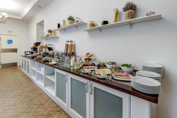 Каждое утро гостям отеля предлагается континентальный расширенный завтрак, который включает: различную выпечку, джем, масло, мюсли, йогурты, мясные и сырные нарезки, сосиски, яйца, каши, овощи, фрукты, а также холодные и горячие напитки.