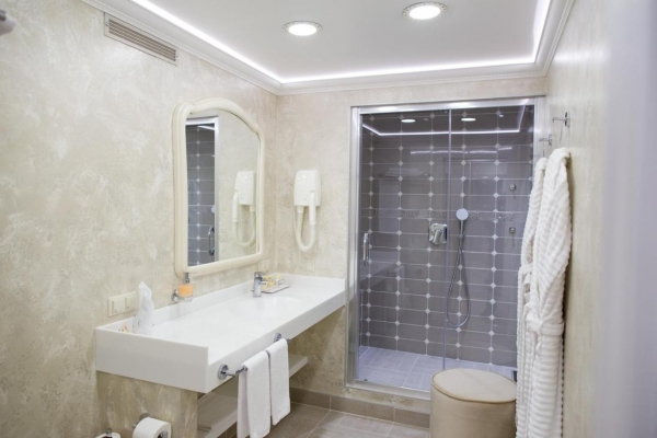 Номера всех категорий гостиницы оформлены в современном классическом стиле, сантехническим оборудованием и матрасами премиум класса , В оснащении каждого номера входит : халат, тапочки, бритвенный и зубной наборы, расческа, шампунь, гель, кондиционер, крем для тела , губка, салфетка для обуви , натуральная минеральная вода в стекле "Нарзан", Чайная станция фирмы Ronnelfildt, негазированная питьевая вода . Есть номера для людей чувствительных к аллергии. Вместо коврового покрытия керамический, подогреваемый пол.