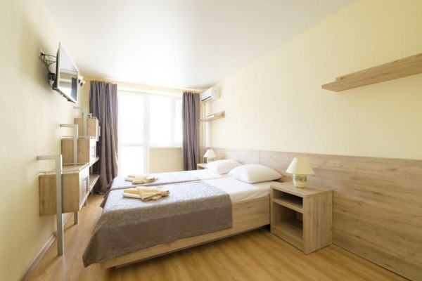Пансионат имеет 120 уютных, современных (ремонт и замена мебели в 2019 году) номеров, в том числе и двухкомнатные. Во всех номерах есть балконы, где вы сможете отдыхать тёплыми вечерами. Wi-Fi, разумеется, доступен и бесплатен. Парковка платная, для неё выделено отдельное место, чтобы не загромождать территорию.