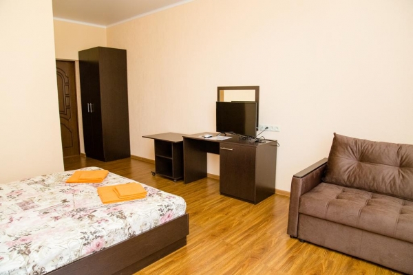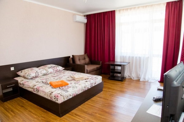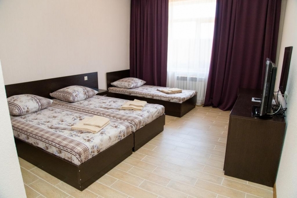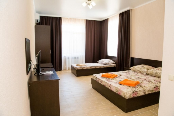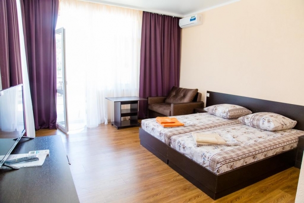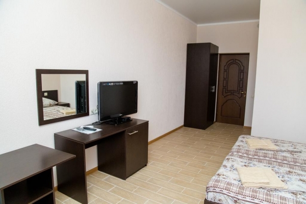 Новое строение, комфортабельные номера (21м.кв), все удобства в номера (Туалет. душевая, кондиционер, телевизор, холодильник, на территории бассейн, батут, кухня. За территорией огороженная автостоянка.