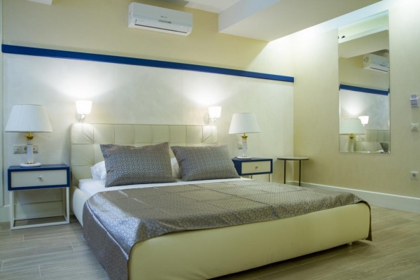 - Семейный 2-комнатный номер с балконом: 56 кв. м, 2-х спальная кровать, 2 тумбочки, журнальный столик, 2-х спальный раскладной диван, шкаф для одежды, кондиционер, телевизор, сейф, телефон и балкон со столиком и стульями.
