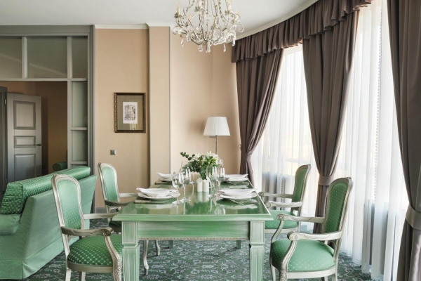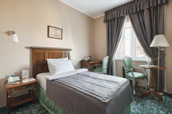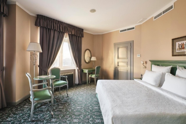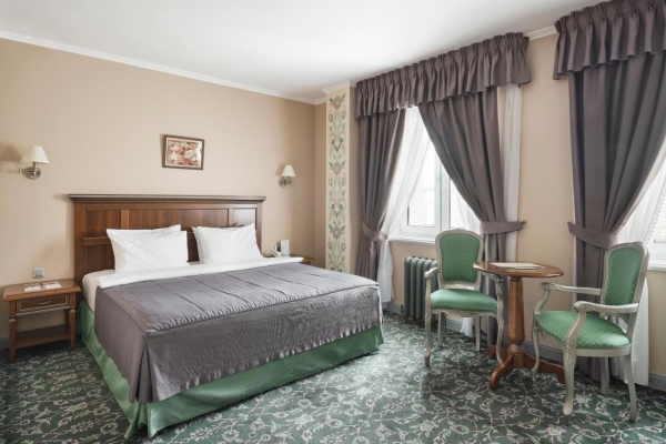 Просторные номера отеля оформлены в русском аристократическом стиле. Во всех номерах бесплатный Wi-Fi, климат-контроль, кабельное телевидение, рабочий стол, сейф и просторная ванная комната с халатами, тапочками и туалетно-косметическими принадлежностями, круглосуточный roomservice.